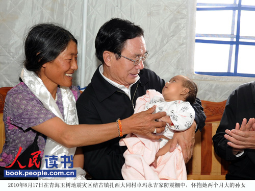 2010年8月17日在青海玉樹(shù)地震災(zāi)區(qū)結(jié)古鎮(zhèn)扎西大同村卓瑪永吉家防震棚中,懷抱她兩個(gè)月大的孫女。