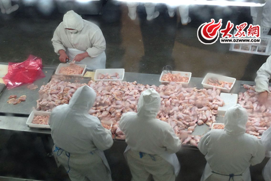 工人們正在車間里把雞腿修剪成標(biāo)準(zhǔn)形狀。 大眾網(wǎng)記者 劉明明 攝