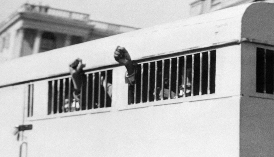 1961年6月曼德拉創(chuàng)建非國(guó)大軍事組織“民族之矛”,任總司令。1962年8月,曼德拉被捕入獄,南非政府以“煽動(dòng)”罪和“非法越境”罪判處他5年監(jiān)禁。1964年6月,曼德拉又被指控犯有“企圖以暴力推翻政府”,改判為無期徒刑。圖為包括曼德拉在內(nèi)的8人在1964年6月16日離開比勒陀利亞的司法大樓時(shí)從鐵窗內(nèi)伸出拳頭。
