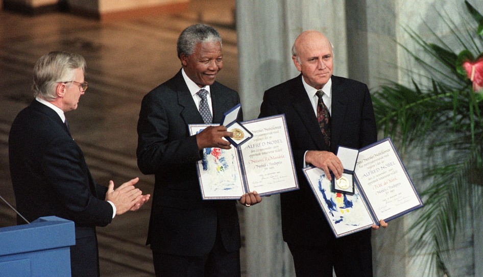 1993年12月10日,時(shí)任非國(guó)大主席曼德拉和南非總統(tǒng)德克勒克在挪威奧斯陸領(lǐng)取當(dāng)年的諾貝爾和平獎(jiǎng)。挪威諾貝爾委員會(huì)當(dāng)年10月宣布授獎(jiǎng)決定時(shí)說(shuō),曼德拉和德克勒克為消除南非種族歧視作出了貢獻(xiàn),他們的努力為在南非建立民主政權(quán)奠定了基礎(chǔ)。