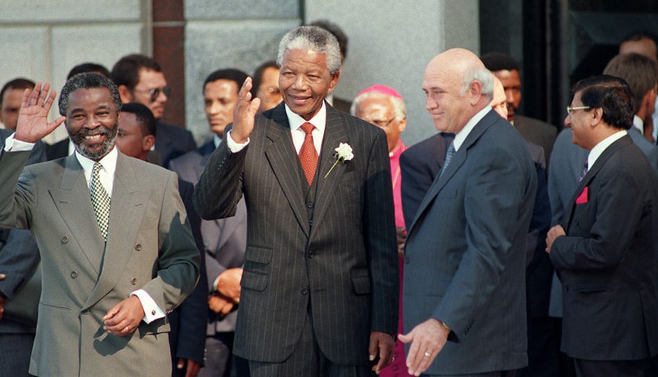 1994年5月9日,時年76歲的非國大主席曼德拉當選為新南非的第一任總統(tǒng),他也成為南非歷史上第一位黑人總統(tǒng)。 圖為曼德拉當選后和兩位副總統(tǒng)姆貝基(左)和德克勒克(右)向媒體致意。