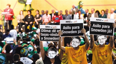 19日,巴西圣保羅,支持者戴著斯諾登面具,要求巴西總統(tǒng)羅塞夫接受斯諾登的避難申請(qǐng)。美國(guó)《華盛頓郵報(bào)》24日刊登對(duì)美國(guó)“棱鏡門”曝光者愛德華·斯諾登的專訪。這是斯諾登6月抵達(dá)俄羅斯以及8月獲準(zhǔn)在俄臨時(shí)避難后,首次接受媒體記者面對(duì)面長(zhǎng)談。