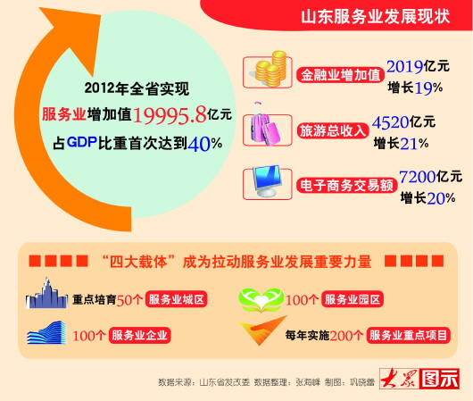11月1日,省政府辦公廳下發(fā)《山東省人民政府關(guān)于加快服務(wù)業(yè)發(fā)展的若干意見》,共30條,提出通過加強(qiáng)引導(dǎo)、增加投入、簡政放權(quán)、優(yōu)化環(huán)境、激勵創(chuàng)業(yè)、推動創(chuàng)新、強(qiáng)化考核等一系列舉措,助推服務(wù)業(yè)改革發(fā)展,力爭到2020年,服務(wù)業(yè)增加值占生產(chǎn)總值比重達(dá)到50%左右,基本形成服務(wù)業(yè)占主導(dǎo)地位的經(jīng)濟(jì)結(jié)構(gòu)。