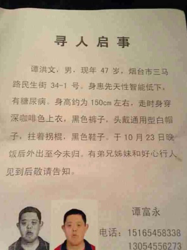 10月31日下午,老父和姐姐再赴牟平。10月31日下午1:30左右,譚富永接到一位市民的電話說,中午11點(diǎn)半左右,看到一位貌似譚洪文的人在牟平北翠市場(chǎng)附近乘坐617路公交車。來到牟平北翠市場(chǎng)后,譚富永四處張貼尋人啟事,并向周圍商販和路過的市民打聽。有市民稱,前兩天在北翠市場(chǎng)附近見過一個(gè)人,應(yīng)該就是譚洪文。譚春玲還到牟平公交公司調(diào)。叮保饭卉嚿系谋O(jiān)控,但不幸的是監(jiān)控壞了。31日,煙臺(tái)市公交集團(tuán)牟平有限公司將譚洪文的事通知了各路司機(jī),一有消息就會(huì)通知家屬。