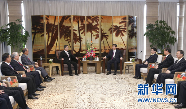 4月8日,中共中央總書記習近平在海南省博鰲會見臺灣兩岸共同市場基金會榮譽董事長蕭萬長一行。新華社記者龐興雷攝