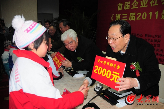 大眾網(wǎng)濟南3月3日訊記者 徐明) 由影響山東網(wǎng)、中外品牌網(wǎng)、山東省經(jīng)濟學(xué)會、山東省信譽評級委員會辦公室等多家單位聯(lián)合倡議發(fā)起舉辦的首屆企業(yè)社會責(zé)任與愛心榜樣公益活動暨《第三屆2011影響山東風(fēng)云人物》大型圖書首發(fā)式3日在濟南山東大廈隆重舉辦。省里老同志陸懋曾、譚福德、董鳳基等出席會議并為來自臨沂、聊城兩市的貧困學(xué)生代表發(fā)放了助學(xué)金及學(xué)習(xí)用品。