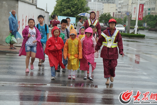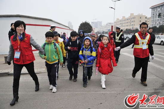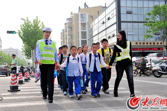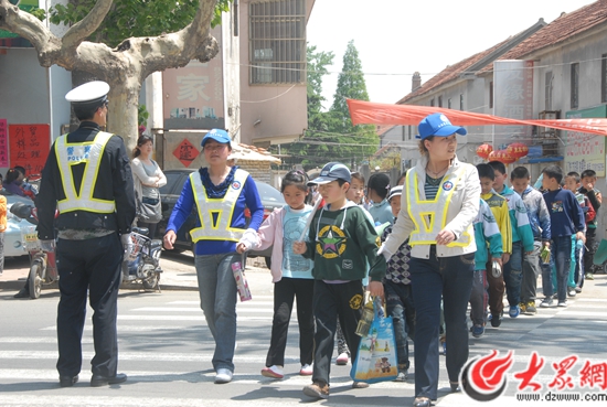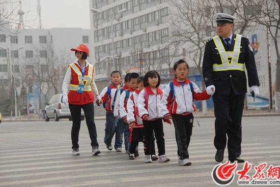 2012年3月1日,山東省日照市新營小學(xué)路口,汪麗麗(左一)和丈夫鄧立剛(右一)護送學(xué)生過馬路!