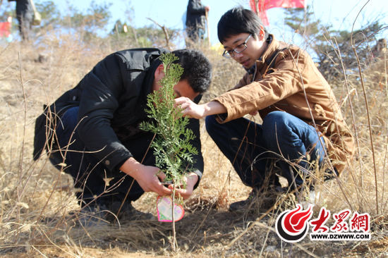 萊蕪愛心志愿者在親手栽種的樹苗上系許愿牌