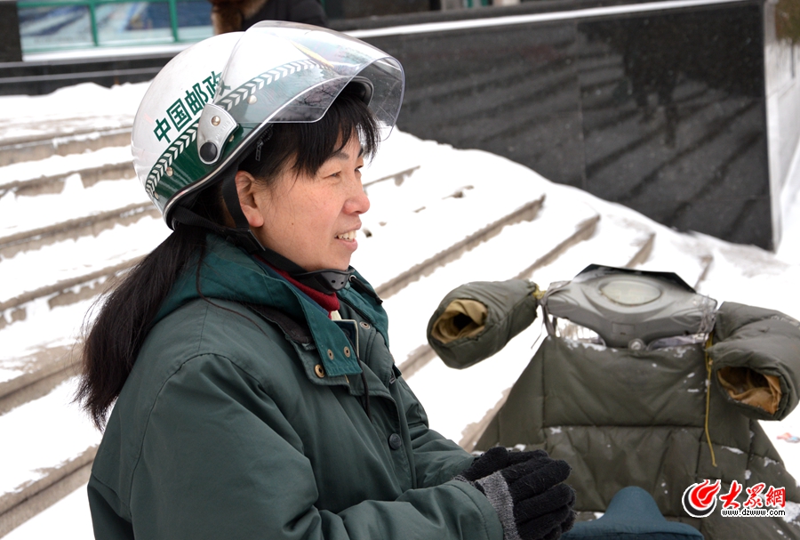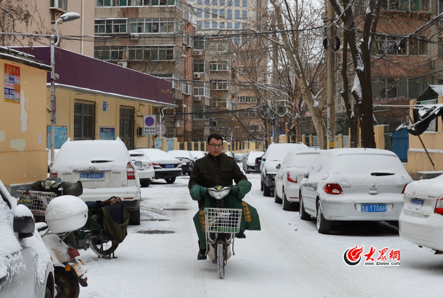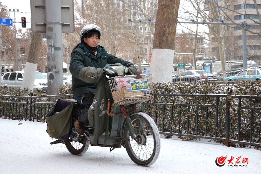 趙大姐第一個(gè)投遞點(diǎn)是濟(jì)南市房管局。我們從經(jīng)二路的濟(jì)南市郵政局向東騎,沿著緯二路南行,雪花一個(gè)勁地與我的脖子和耳朵“親密接觸”。騎了不到1公里,我耳朵便從最初的“發(fā)麻”,變成“火燒一樣的疼”……我趕緊從附近商店買了倆耳套,自己帶上一個(gè),另一個(gè)遞給了趙大姐。她看著我窘迫的樣子,有些無奈地笑了:“我習(xí)慣了,帶上反而不得勁!
