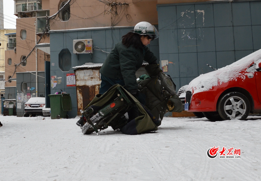 今天下午15點(diǎn),我與濟(jì)南郵政局44歲的郵遞員趙翠琴約好,一起騎上電瓶車體驗(yàn)風(fēng)雪中的投遞工作?紤]到天氣很冷,我穿了很厚的衣服,也帶上手套和帽子。出發(fā)前,趙大姐囑咐我別騎太快,一是風(fēng)很刺骨,二是雪中騎車,隨時(shí)有可能滑倒。