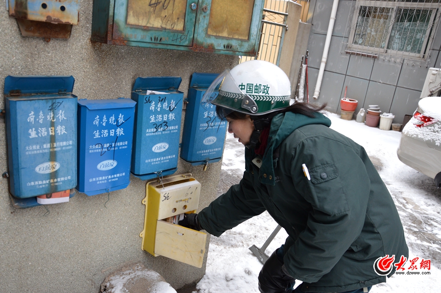 說起投遞員的工作,許多人的腦海中便會(huì)浮現(xiàn)出這樣一個(gè)畫面:一身綠制服、大梁的自行車、敦實(shí)的郵筒……而趙翠琴拂去臉上的雪,有些傷感地說,自己干了11年郵遞員,現(xiàn)在寫信的是越來越少了。但郵遞員是個(gè)良心活,身上肩負(fù)寫信人的信任和囑托,F(xiàn)在,他們大量的工作不再是送信,而是送報(bào)紙。趙翠琴負(fù)責(zé)樂山小區(qū)好幾十戶的送報(bào)任務(wù),穿梭在小區(qū)中,不時(shí)有熟絡(luò)的居民向她打招呼,說“這么個(gè)天,你騎車可得注意。 倍藭r(shí)臉會(huì)漲得更紅,點(diǎn)點(diǎn)頭一笑,放下報(bào)紙,再?zèng)_向下一戶。