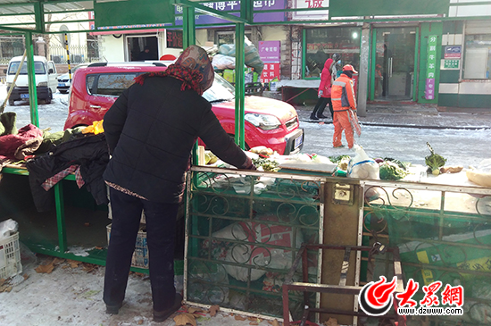 老張的攤位本來在小區(qū)菜市場的中間位置,但今天天冷,出攤的人少,他就把攤位挪到了最東頭,“這邊能曬到太陽,起碼能暖和一點”。記者看到,雖然搬到了朝陽的地方,但攤位所在的位置,地面上仍有積雪,而且菜架四面漏風,沒有一點防寒措施,記者和老張只能來回走動來取暖,不到半個小時就被凍透了。老張的妻子中午回家做飯,回到攤位后仍是止不住的感覺到冷,她說,回家待了個把小時,兩腳還是冰冷,沒有暖和過來。