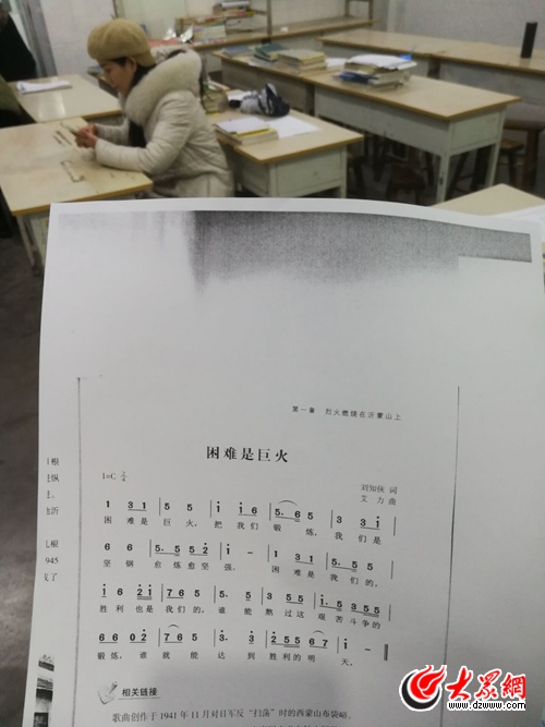 12月3日,采訪團(tuán)來(lái)到沂南縣第二中學(xué),見(jiàn)到了這首歌的發(fā)掘者、《沂蒙紅歌》主編秦丕山,聽(tīng)他講述起尋找這首革命歌曲的過(guò)程。
