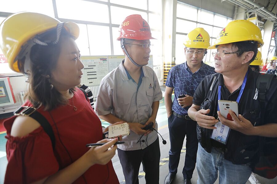 采訪團(tuán)記者在采訪山東臨工工作人員。
