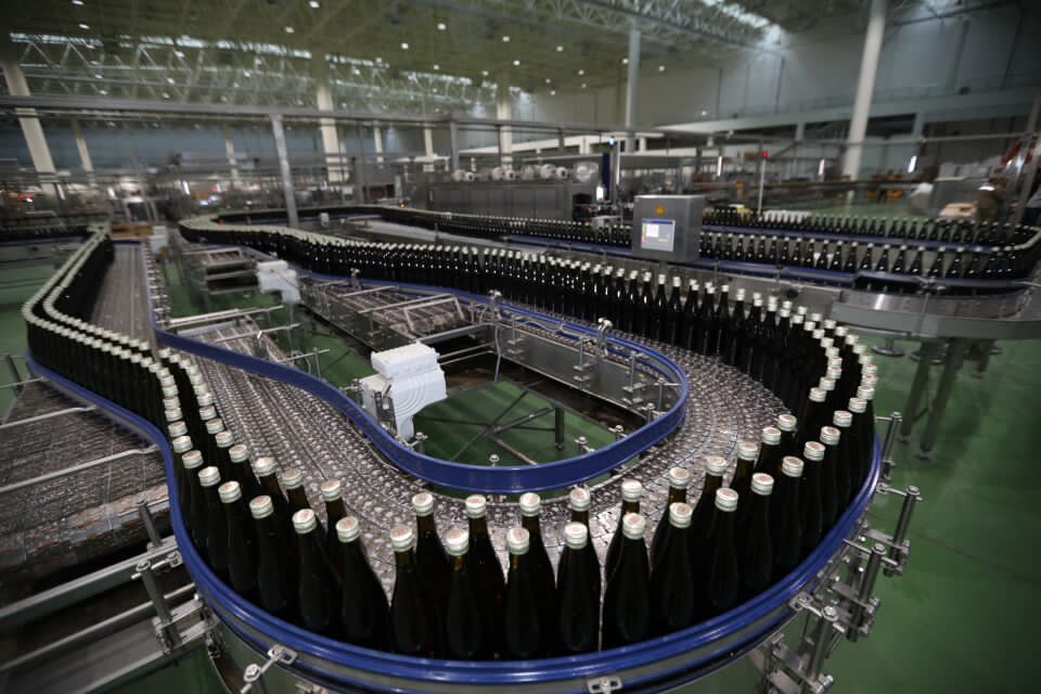 張?jiān)H葡萄酒城灌裝車間內(nèi)的白蘭地灌裝線。