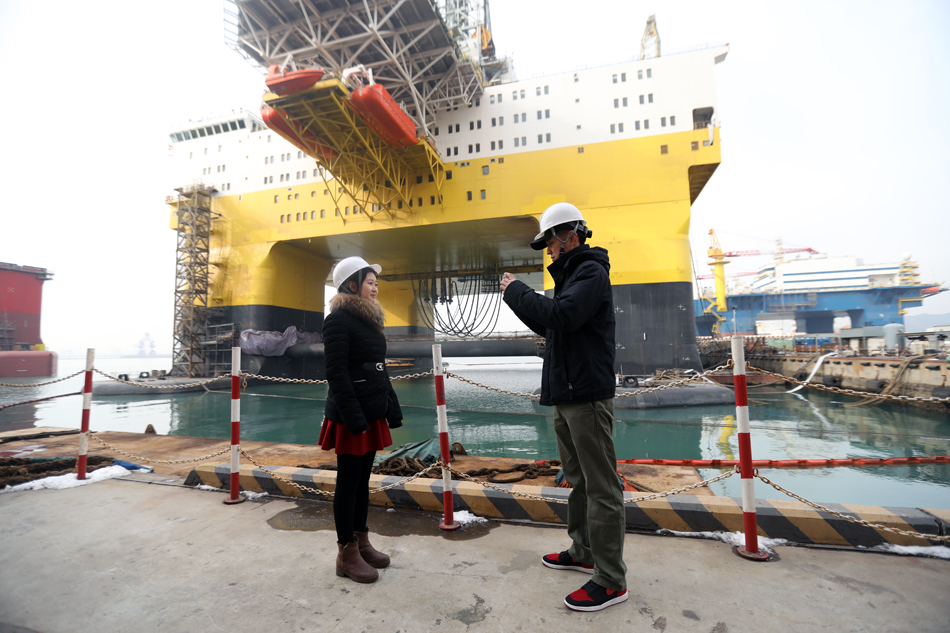 采訪團的記者在中集來福士藍鯨二號前接受采訪。