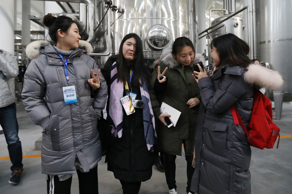 在張裕國際葡萄酒城的生產(chǎn)車間,記者在對著鏡頭做手勢。
