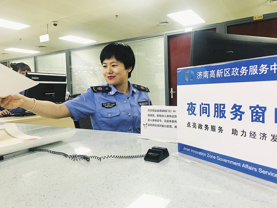 趙文珂向記者介紹,高新區(qū)繁華商圈比較多,像萬(wàn)達(dá)、美蓮、雨滴廣場(chǎng)等商業(yè)中心,再加上齊魯軟件園,這些區(qū)域商戶很密集,業(yè)務(wù)辦理需求量比較大,為了在發(fā)展夜經(jīng)濟(jì)的大環(huán)境中給商戶們提供便利,“夜間業(yè)務(wù)窗口”在半月前開(kāi)通,辦理的業(yè)務(wù)主要是企業(yè)和個(gè)體工商戶的開(kāi)辦登記等,服務(wù)時(shí)間是從18:00到22:00,每晚有兩名工作人員值班!半m然規(guī)定服務(wù)時(shí)間是到晚上十點(diǎn),但是如果客戶有需要,我們也可以延遲下班時(shí)間。”趙文珂說(shuō),從去年起,高新區(qū)市場(chǎng)監(jiān)管局就利用“商事登記自助服務(wù)設(shè)備”在全市率先實(shí)現(xiàn)了自助服務(wù)“24小時(shí)不打烊”。今年4月份又全面啟動(dòng)了“周末無(wú)休”商事登記,再加上這次推出的“夜間服務(wù)”,真正實(shí)現(xiàn)了“24×365”的服務(wù)機(jī)制。采訪間隙,一位商戶就通過(guò)24小時(shí)自助服務(wù)設(shè)備領(lǐng)取了營(yíng)業(yè)執(zhí)照。