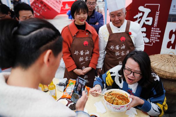 “云南的小鍋米線,這個可和過橋米線完全不一樣哦,煮這個必須要用小銅鍋,還要加入特色的拓東醬油,味道特別濃厚!”在鏡頭前,大胃浪胃仙抬著一碗由云南省餐飲與美食行業(yè)協(xié)會副會長、元老級注冊中國烹飪大師、中國滇菜飲食文化大師蔣彪在現(xiàn)場親手烹煮的小鍋米線,大快朵頤,不亦樂乎,一邊與鏡頭另一端的粉絲們熱情互動,引來現(xiàn)場眾多市民爭相圍觀。