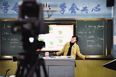 長(zhǎng)沙麓山國(guó)際實(shí)驗(yàn)小學(xué)英語(yǔ)老師陳輝在教室內(nèi)通過(guò)攝像頭直播網(wǎng)絡(luò)課程。新華社發(fā)