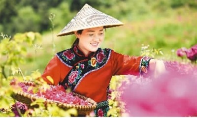 5月3日,村民在貴州省銅仁市松桃苗族自治縣黃板鎮(zhèn)臘沖村玫瑰產(chǎn)業(yè)園采收玫瑰花。 龍?jiān)驍z