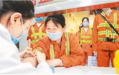 5月3日,環(huán)衛(wèi)工人正在重慶市沙坪壩區(qū)一醫(yī)院接受采血檢查。張錦輝攝(人民視覺)