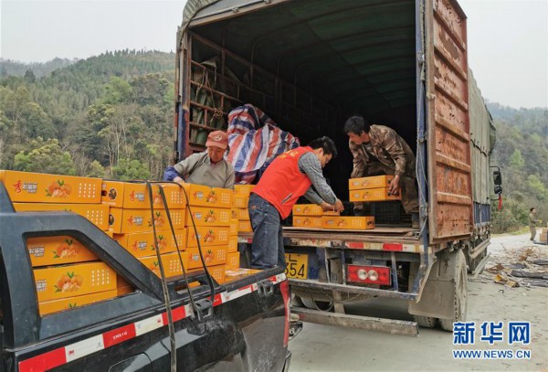 樂業(yè)縣百坭村駐村第一書記楊杰興(中)幫村民搬運農(nóng)產(chǎn)品(2月26日攝)。 新華社記者 王念 攝