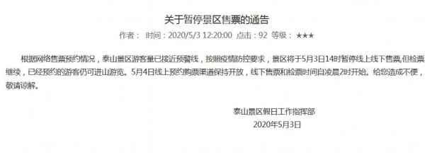 據(jù)泰山風(fēng)景名勝區(qū)官方網(wǎng)站消息,今日,泰山景區(qū)假日工作指揮部發(fā)布通告稱,根據(jù)網(wǎng)絡(luò)售票預(yù)約情況,泰山景區(qū)游客量已接近預(yù)警線,按照疫情防控要求,景區(qū)將于5月3日14時(shí)暫停線上線下售票,但檢票繼續(xù),已經(jīng)預(yù)約的游客仍可進(jìn)山游覽。5月4日線上預(yù)約購(gòu)票渠道保持開(kāi)放,線下售票和檢票時(shí)間自凌晨2時(shí)開(kāi)始。給您造成不便,敬請(qǐng)諒解。