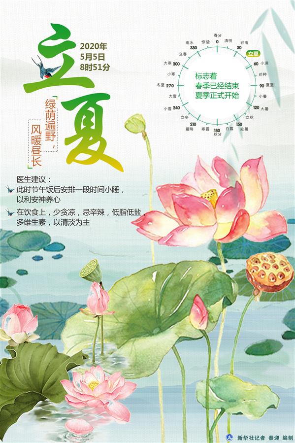新華社天津5月3日電(記者周潤健)“忽驚夏向明朝立,便恐春從此地更。”《中國天文年歷》顯示,北京時間5月5日8時51分,迎來二十四節(jié)氣中的“立夏”,這一天在天文學(xué)上是告別春天、迎來夏日的轉(zhuǎn)折點(diǎn),標(biāo)志著春季已經(jīng)結(jié)束,夏季正式開始。此時節(jié),綠蔭遍野,風(fēng)暖晝長,橫塘新荷,花叢蝶忙。