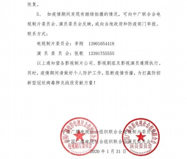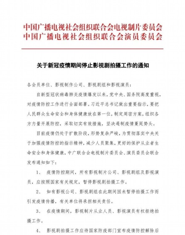 中新網(wǎng)2月1日電 據(jù)中國影視制片微信公眾號消息,中國廣播電視社會組織聯(lián)合會電視制片委員會與中國廣播電視社會組織聯(lián)合會演員委員會1日聯(lián)合發(fā)布關(guān)于新型肺炎疫情期間停止影視劇拍攝工作的通知。通知要求,疫情防控期間,所有影視制片公司、影視劇組及影視演員,應(yīng)按照國家有關(guān)規(guī)定,暫停影視劇拍攝工作。