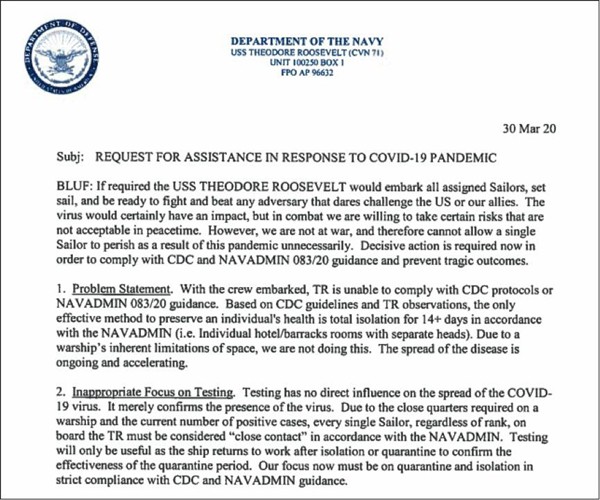 為遏制新冠病毒在“羅斯!碧(hào)上傳播,前任艦長克羅澤致信海軍高層,呼吁盡快讓船員下船隔離。他將航母與“鉆石公主”號(hào)郵輪相比較,稱航母無法有效隔離近5000名官兵,疫情可能比郵輪嚴(yán)重許多。這封求助信被美國媒體曝光后引發(fā)輿論廣泛關(guān)注。