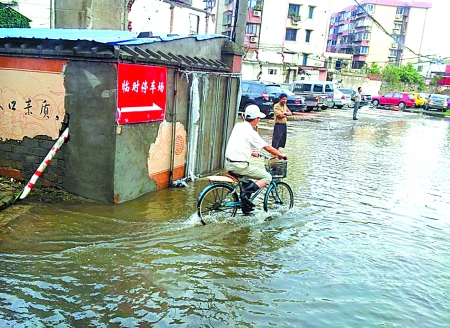 大爺說,前天因“?眮硪u,臨時停車場關閉。昨天清晨6時半,他騎著自行車來開門!半m然臺風已過,但從停車場到外面彩虹南路積水嚴重,最深處已經淹到這里!贝鬆斢檬衷谛⊥壬媳葎。
