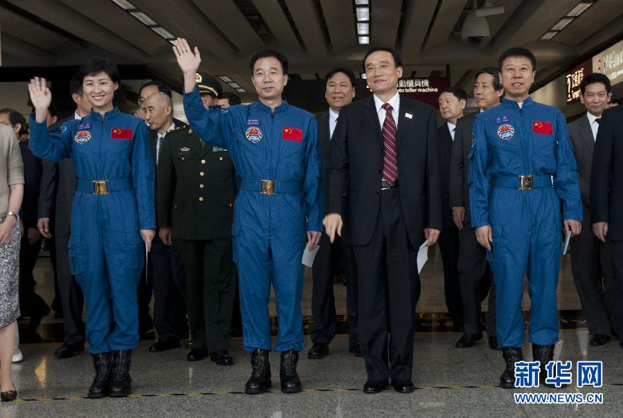 8月10日,航天員景海鵬(前右三)、劉旺(前右一)、劉洋(前左一)等代表團(tuán)成員抵達(dá)香港國際機(jī)場。當(dāng)日,天宮一號(hào)與神舟九號(hào)載人交會(huì)對(duì)接任務(wù)代表團(tuán)抵達(dá)香港,開始為期4天的訪問。 新華社記者呂小煒攝