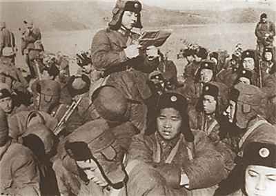 戰(zhàn)友們休息時,雷鋒抓緊時間為大家念報紙。 (來源:工人日報)