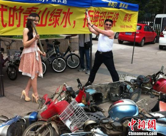 在活動現(xiàn)場,陳光標和《甄嬛傳》中槿汐的扮演者孫茜將現(xiàn)場的鉛酸電池電動車砸碎斷然拒絕鉛污染。盛捷
