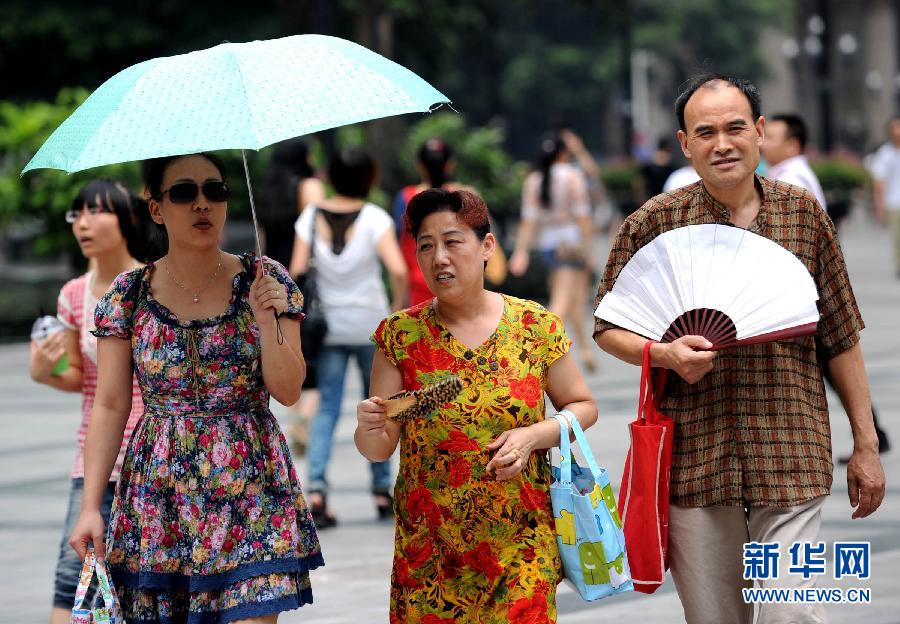 8月13日,幾位市民冒著高溫在解放碑逛街。連日來,素有“火爐”之稱的重慶市遭遇持續(xù)高溫天氣,最高氣溫維持在35℃以上。重慶市氣象臺于13日11時50分再次發(fā)布“高溫紅色預(yù)警”信號。這也是繼12日后,重慶今年第二次發(fā)布高溫紅色預(yù)警。預(yù)計今天12時到18時,該市潼南、渝北等地日最高氣溫將升至37℃以上,南岸、九龍坡、大渡口等地日最高氣溫將升至40℃以上。新華社記者 李健 攝