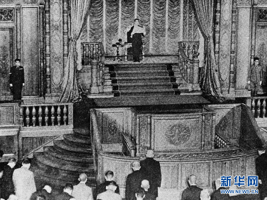 1945年8月15日,日本天皇裕仁廣播“終戰(zhàn)詔書”,宣布日本無條件投降。圖為日本天皇在議會宣布投降。 新華社發(fā)