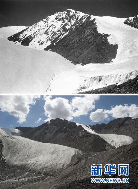 這張拼版照片顯示的是1983年拍攝的天山一號(hào)冰川一角(上圖)和2012年拍攝的天山一號(hào)冰川分離為東支與西支兩條獨(dú)立的冰川(下圖)。據(jù)中科院天山冰川觀測(cè)試驗(yàn)站觀測(cè)數(shù)據(jù)顯示,隨著氣溫逐年升高,新疆天山一號(hào)冰川持續(xù)加速消融和退縮。 新華社發(fā)