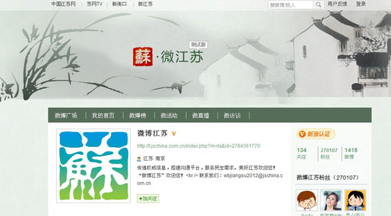 “微博江蘇”――“博通江蘇,連接你我”,將通過文字、圖片、視頻等多種形式,傳遞權(quán)威信息,搭建溝通平臺(tái),服務(wù)民生需求,分享美好感受,展示江蘇人文特色,拓展交流和服務(wù)空間。自4月28日試運(yùn)行以來,“微博江蘇”已發(fā)布微博1400余條,引用轉(zhuǎn)發(fā)15000次,網(wǎng)友評(píng)論近5000 次。