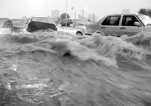 在濟(jì)南市馬鞍山路上拋錨的汽車(7月18日攝)。7月18日傍晚,一場強(qiáng)暴雨襲擊濟(jì)南市!跣氯A社發(fā)