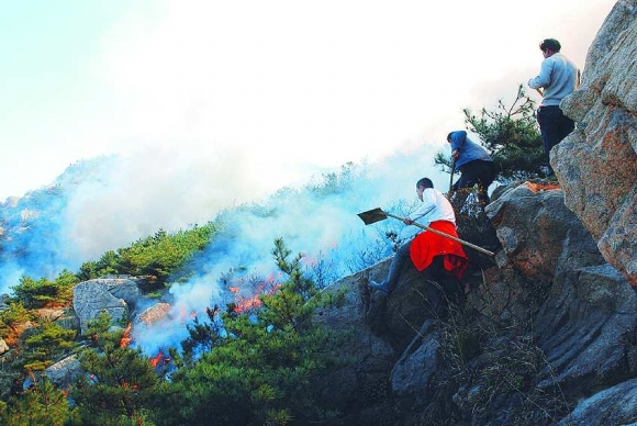 4日上午11時(shí),位于日照市東港區(qū)的河山山系發(fā)生大火,逾千軍民緊急上山滅火。本報(bào)見習(xí)記者 張照朋 攝