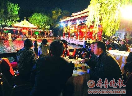 從4月18日起,趵突泉公園夜間“觀泉品茶”文化廣場重新開放,公園開放時間也調(diào)整為7:00至21:00。夜場期間票價減半,公園年票、通游年票正常使用,老年證等免費(fèi)證件不能使用。圖為游客在觀泉品茶。