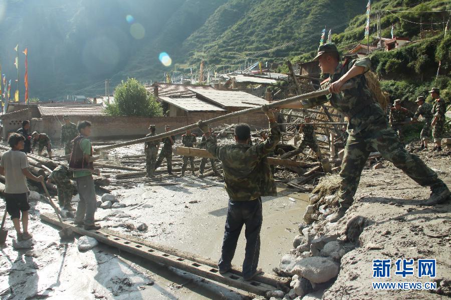 [提要] 8月15日,武警甘肅省森林總隊迭部大隊官兵在山洪災(zāi)區(qū)與當(dāng)?shù)卮迕褚黄鸢徇\木材。8月13日晚,甘肅省甘南藏族自治州迭部縣卡壩鄉(xiāng)突降暴雨,導(dǎo)致該縣尼欠村交通、通訊、電力中斷、民房、農(nóng)田基礎(chǔ)設(shè)施等受災(zāi)損失嚴(yán)重。