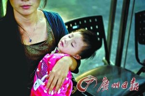 10月5日廣州塔電梯急停后,一位母親抱著孩子坐在售票大廳里,依然驚魂未定。