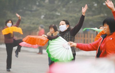 12月6日,太原霧霾侵城。在迎澤公園,有市民戴著口罩晨練。新華社記者 燕 雁攝