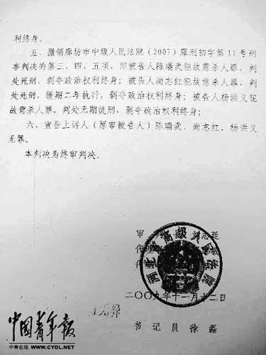 涉案的7名被告均不服,而向河北省高院提起上訴,同年12月,省高院以“有的事實(shí)尚不清楚”為由,將兩起滅門(mén)案發(fā)回重審;2004年6月2日,廊坊中院進(jìn)行了部分改判,除陳瑞武、原偉東等三人維持死刑外,尚志紅被改判死緩,楊洪義被改判無(wú)期,其余兩名被告被判無(wú)罪。