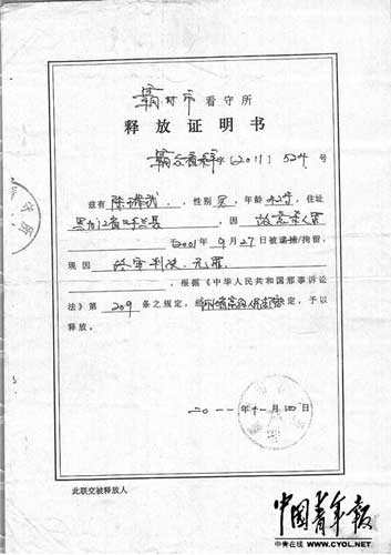 河北省高級(jí)人民法院的無(wú)罪判決書(shū)(上)是2009年11月12日作出的,但陳瑞武的釋放證明書(shū)(下)表明,他直到2011年11月4日才被釋放。