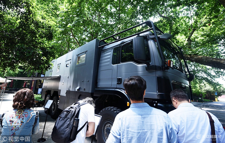 2018年5月9日,在杭州西湖邊的道路上拍攝到的豪華越野房車(chē)。 近日,一輛超級(jí)豪華越野房車(chē)亮相杭州西湖邊,其令人吃驚的銷售價(jià)格吸引了不少路過(guò)的市民前來(lái)觀看。