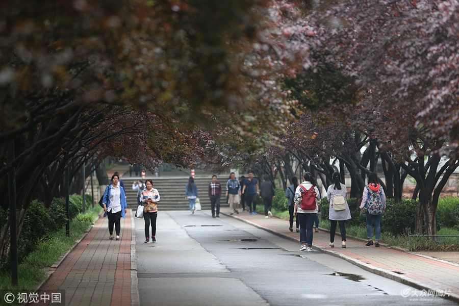 2018年5月22日,濟(jì)南,一場(chǎng)雨過(guò)后,山東師范大學(xué)校園內(nèi)植物被沖刷干凈,紫色樹葉搭配綠色草地。學(xué)生走在其中,如同徜徉在浪漫的紫色海洋。