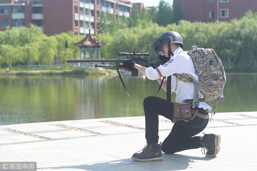 2018年5月19日,山東青島,山東科技大學(xué),大四學(xué)生拍“吃雞”畢業(yè)照紀(jì)念青春。圖為王新龍手拿AWM狙擊步槍模擬游戲中的動(dòng)作正在瞄準(zhǔn)。